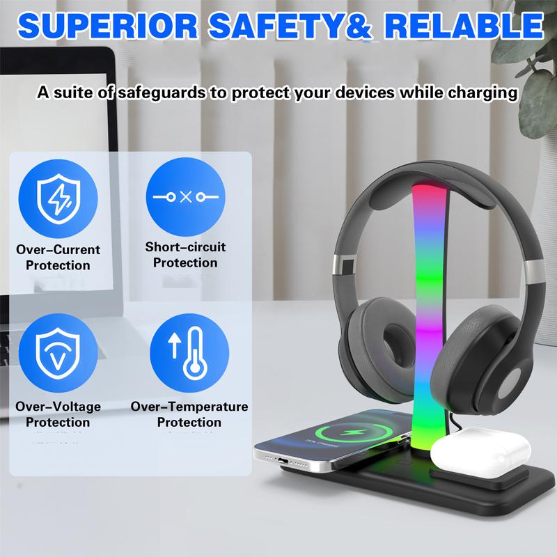 3in1 Headphones Stand Wireless Charger RGB Atmosphere Light Gaming Headset Bracket Mobile Phone Bluetooth Earphone Charging DockDOUBLE OUTPUTDESIGNTYPC-C+USBUSB port can be used to power other devices that are not TYPE-C, 5V/2A(max).TYPC-C output can be used to charge headphones and power other TYPE-C devices, 5V/2A(max).TYPC-C input connects to QC3.0 standard power adapter to power 3IN1 wireless charger (standard accessory),5V/2A,9V/2A,12V/2A. MULTI COLOR LIGHTING SWITCH MODE Superior security & reliabilityA suite of safeguards to protect your devices while charging.Over-Current Protection,Short-circuit Protection,Over-Voltage Protection,Over-TemperatureProtection. INSTALLATION STEPS1.Insert the bracket into the station2.Press down hard it Hold Parameters:1.Input: 5V/2A 9V/2A 12V/2A2. Output: 15W/10W/7.5W/5W3. Headphone output power: 5W4.USB/A+C port output power: 10W5. Material: ABS + silicone6. Power input interface: TYPE-C7.Product size: 200*98*222mm8.Gross weight:300gPacking list:1 * headphone holder(NO retail package)