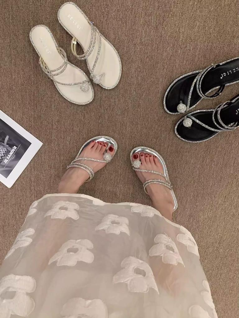High heels toe low fashion outing summer sandals thick heel slippers mint mambo heel rhinestone clip