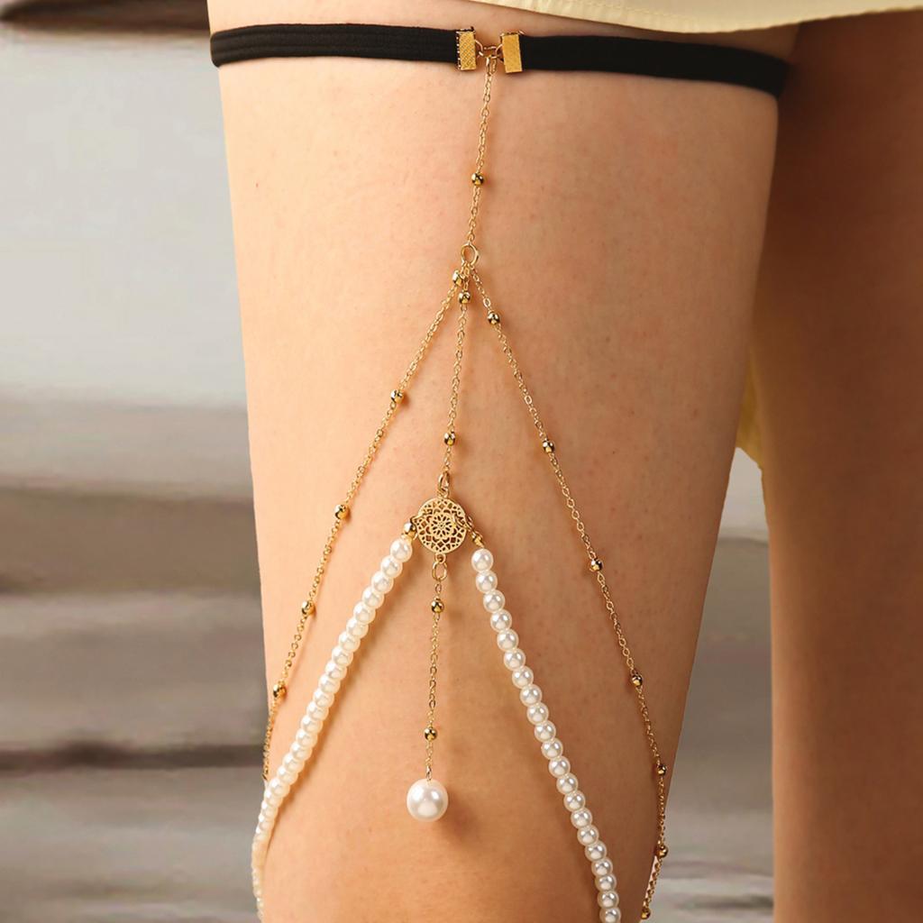Sexy Beachs Imitation Pearl Thigh Chain Female Geometric Tassel Body Chain Rhinestone Metal Chain Leg Ring Female