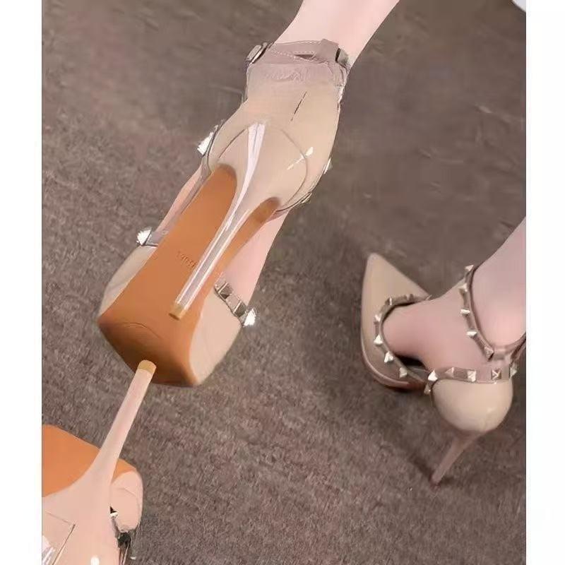 Rivet royal sister temperament sandals women's nude summer niche thick heel women's sexy pointed waterproof table high heels