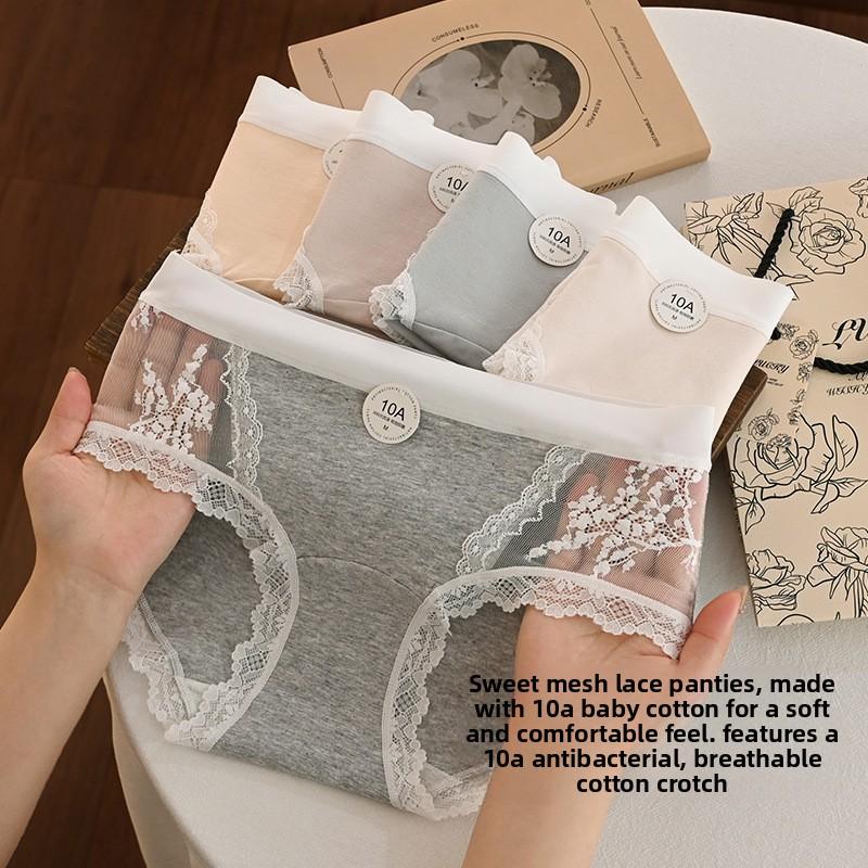 Women's Spring and Summer Mesh Lace Splicing Cotton 10A Antibacterial Inner File Middle Waist Briefs