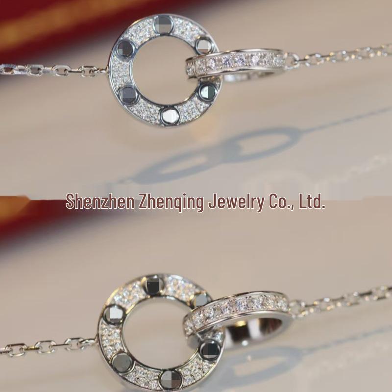 925 Sterling Silver LOVE Double Ring Necklace with Full Diamond Round Disc and Geometric Clavicle Chain