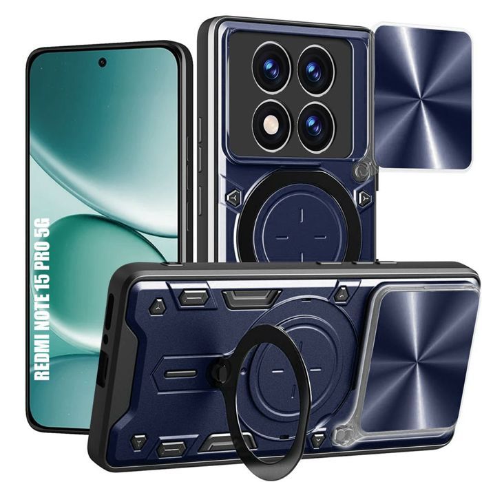 Coque pour Xiaomi Redmi Note 15 Pro 5G, avec Anneau Rotatif et Protection Caméra - Bleu Marine