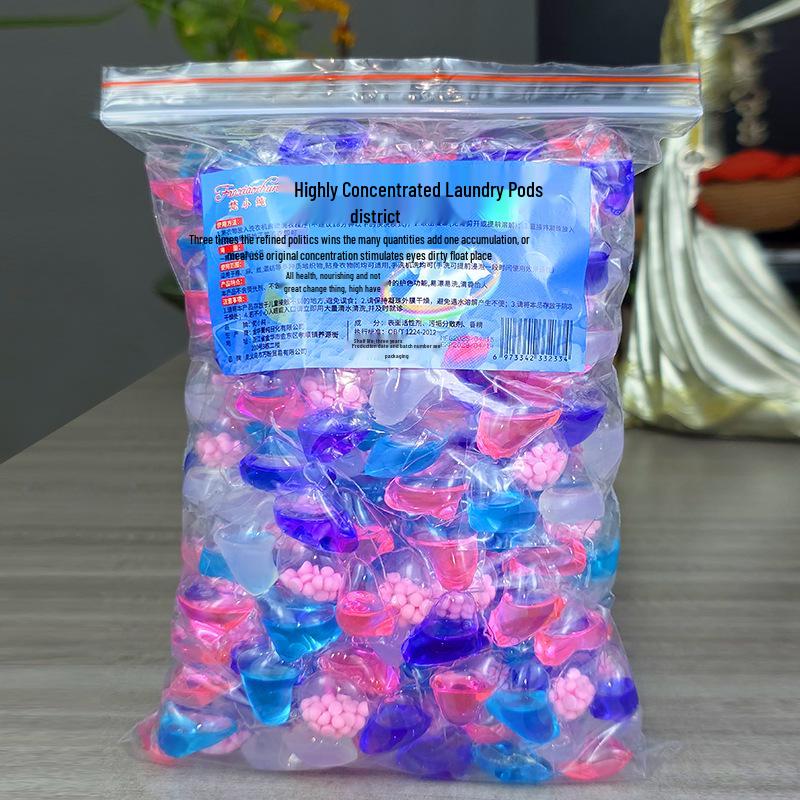 100-piece pack of five-in-one laundry pods with fragrance, softening, stain removal, and five-chamber design.