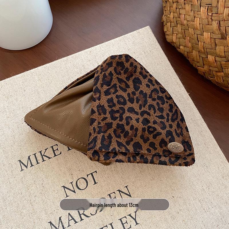 Leopard Print Triangular Hair Clip: High-End Retro Leather & Fabric Hair Accessory for Women