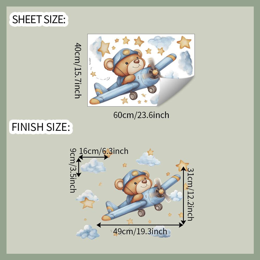 Cartoon Bear Flying Airplane Stars Clouds Wall Sticker Self-Adhesive Removable for Bedroom Living Room Background Home Decor