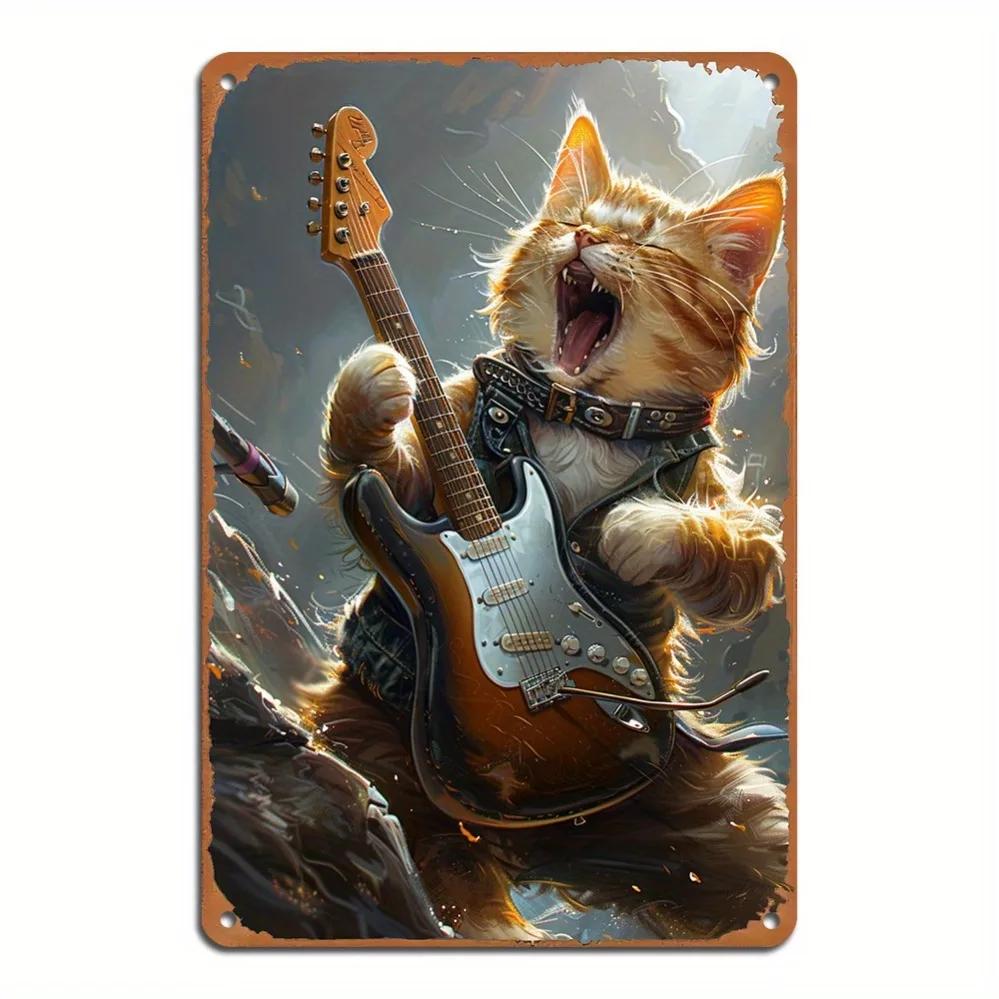 2d Rock Cat Electric Guitar Wall Art for Music Lovers Home Decor Durable Colorful Metal Plaque Guitar Style Room Accent