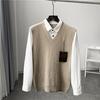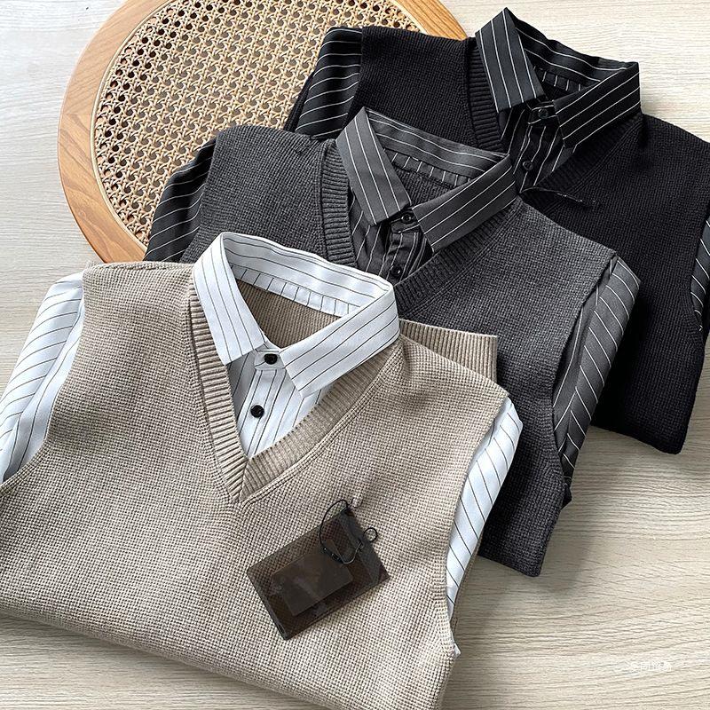 Elevate your autumn and winter wardrobe with this British-style knit vest shirt, designed for men seeking comfort and style. This two-in-one sweater features a loose fit, ensuring relaxed wear throughout the day. The round neckline and long sleeves add a classic touch, making it versatile for various occasions. Crafted with thick polyester material, it provides warmth and coziness during colder months. Perfect for layering, this textured knit vest shirt combines sophistication with casual appeal, making it a must-have for the season.
