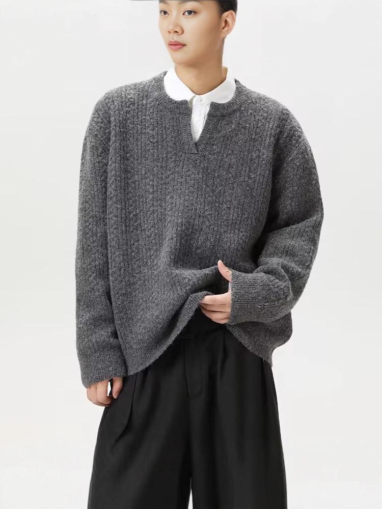 Men’s Retro V-Neck Cable Knit Sweater - Loose Fit, Solid Color, Autumn/Winter Pullover