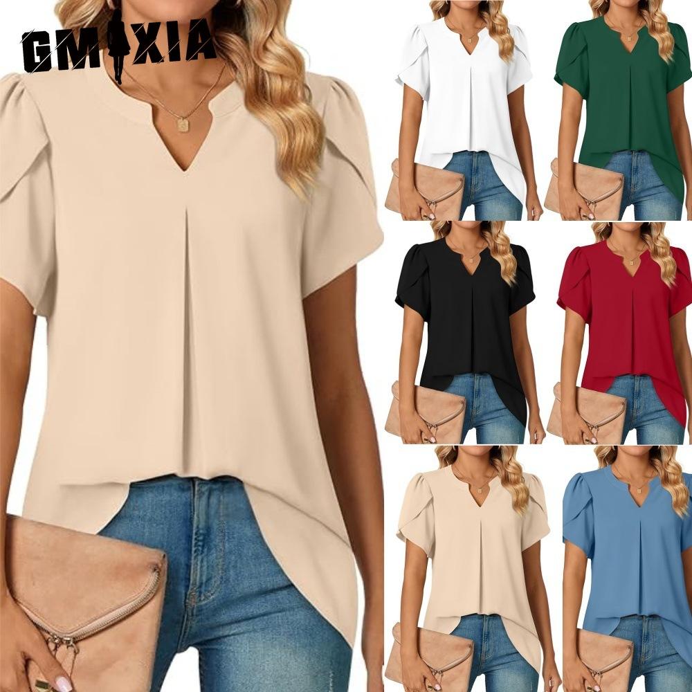 GMXIA Kadın Modası Günlük Düz Renk Desen Kısa Kollu V Yaka Bluzlar ve Gömlekler