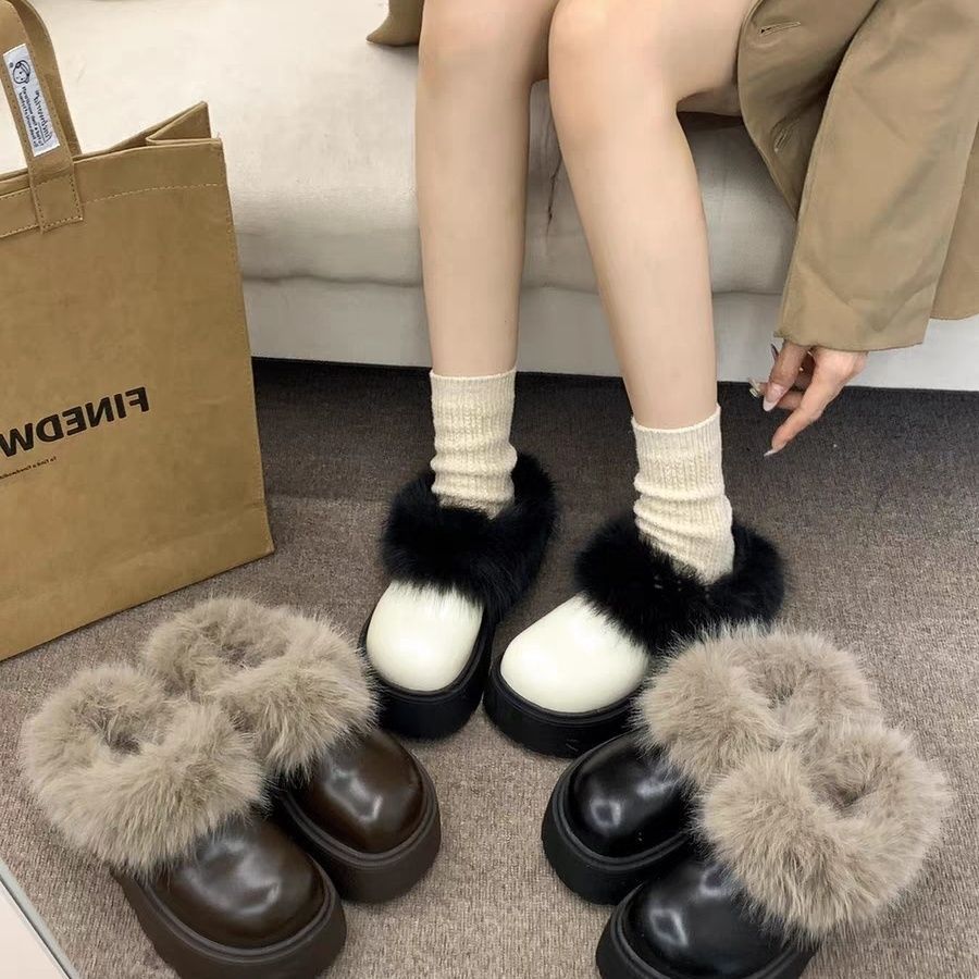 Non-slip cotton shoes are comfortable and piled on one foot, and leather Birkenstock snow boots are worn outside. Women's winter fluffy shoes