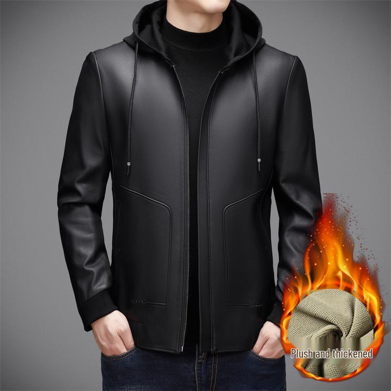 Experience ultimate comfort and style with this hooded leather jacket designed for men of all ages. Crafted from thickened sheepskin, this jacket features a plush, velvet interior, ensuring warmth and coziness during cooler months. The sleek, solid pattern adds a timeless, casual dad style to your wardrobe, perfect for any occasion. Made from 100% genuine leather, it offers durability and a luxurious feel, making it a versatile outerwear choice for every man.