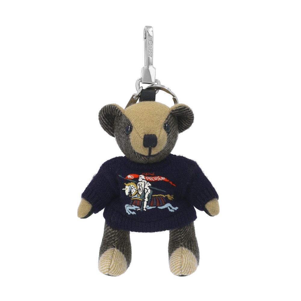 The Burberry 8115937 A2993 Thomas Bear Charm Keyring is inspired by Burberry's iconic teddy bear design, made from a luxurious blend of cashmere and wool. This keyring measures approximately 13.5 cm x 18 cm, offering a soft and realistic texture, complemented by a vintage-inspired style. It features a metal ring and snap hook clasp, making it easy to attach to bags or keys, and the Burberry Equestrian Knight logo is engraved to elevate its brand prestige.