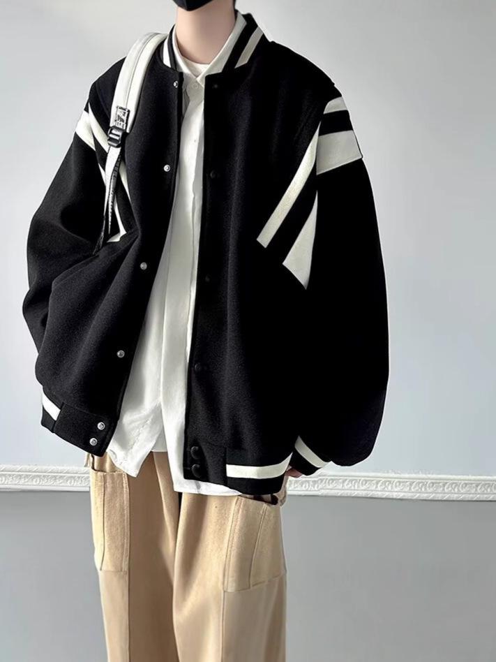 This Men's Retro Color-Block Baseball Jacket is designed for those seeking a stylish, high-street look during the spring and fall seasons. Featuring a stand neckline and long sleeves, this medium-thickness jacket offers comfort and versatility. The solid pattern and blend of polyester and chemical fiber materials give it a cool, contemporary appeal. Perfect for fashion-forward individuals or matching outfits for couples, this jacket seamlessly blends classic style with modern hipster vibes.