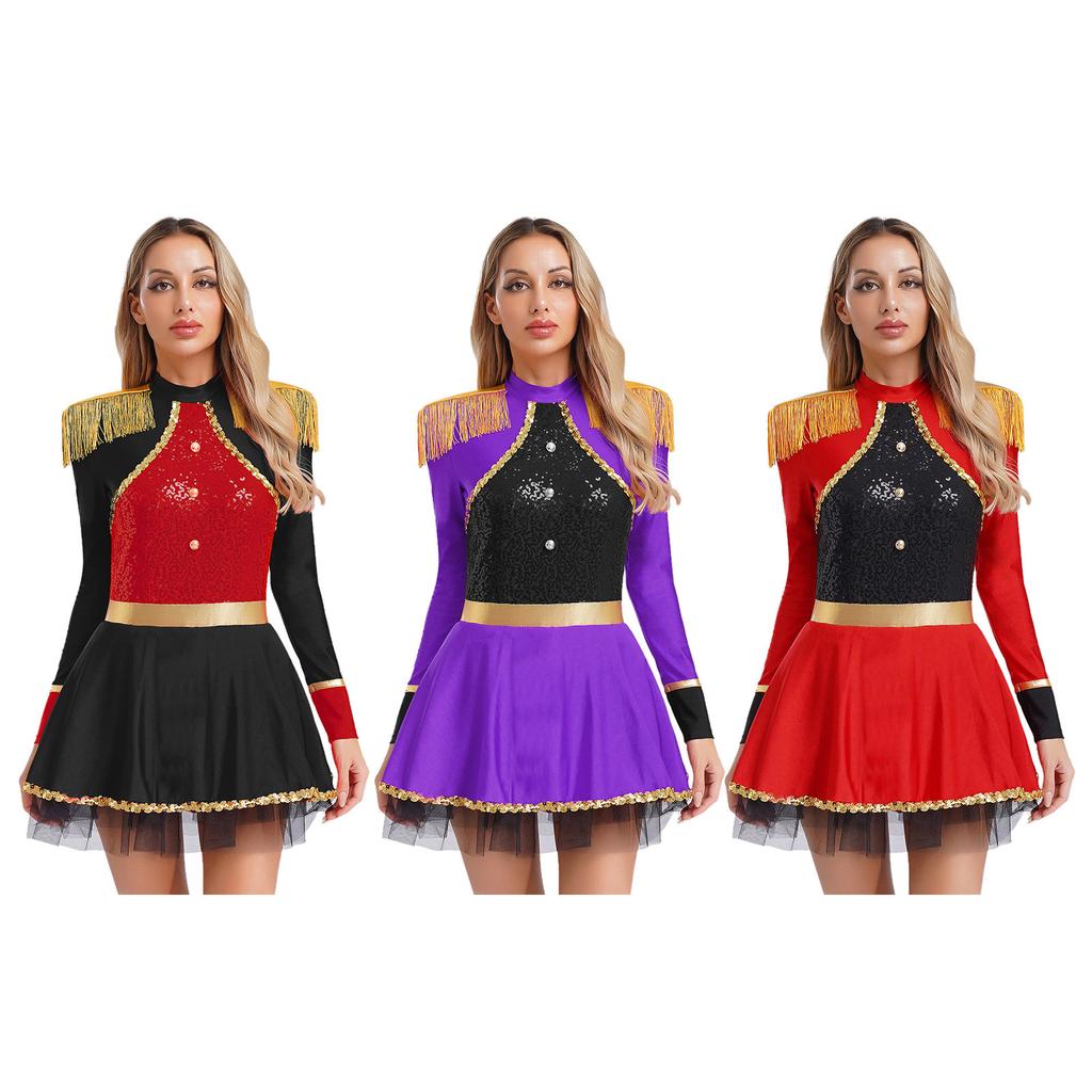 S-XXL Women‘s Stage Performance Bodysuit: Sexy Circus Ringmaster Dress with Long Sleeves, Fringe & Allover Sparkling Sequins