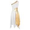 Sleeveless dance dress for women, one shoulder, metallic shiny color block patchwork design, creating a vibrant, unique and stunning look.