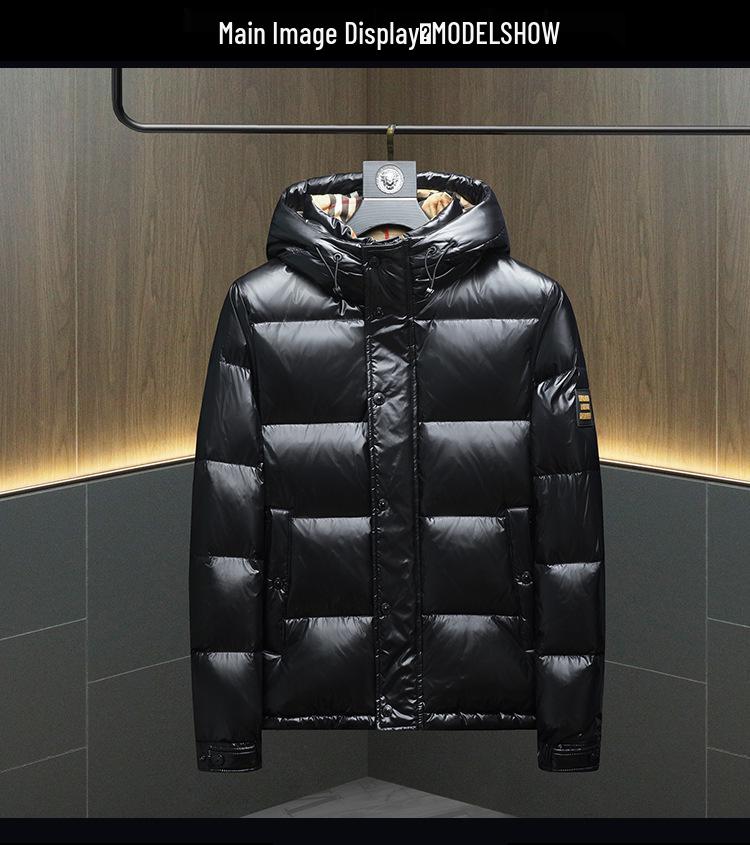 Stay stylish and warm with this men's winter jacket, featuring a glossy white finish. Designed with a regular fit and crafted from a cotton blend for comfort, it is filled with insulating duck down to provide optimal warmth during chilly days. The medium-thickness outerwear includes a stand neckline and a hood for added protection against the cold. Its solid pattern and cotton-blended fur details offer a sophisticated and trendy look for any winter excursion.