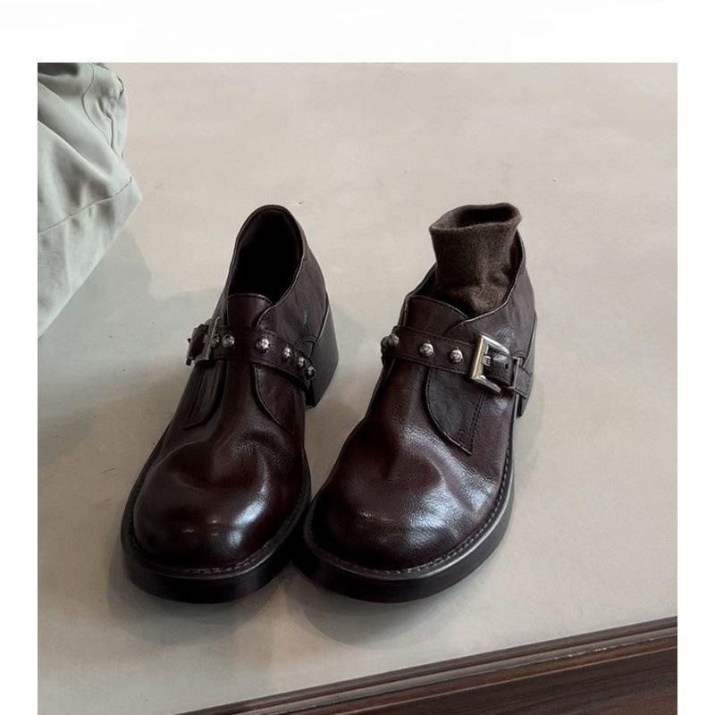 Fashion riveting British style small leather shoes brown small single shoes women's thick heel