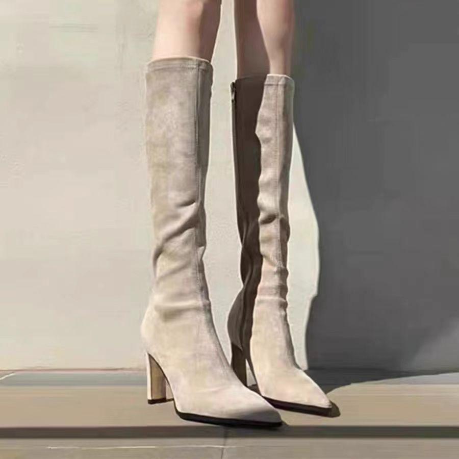 Knee suede boots women's thin boots autumn high boots pointed high heels apricot but elastic