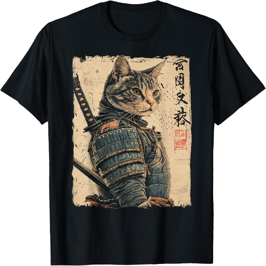 Samurai Cat Warrior Japanese Ukiyo-e Artwork Cat Samurai T-Shirt(1)
