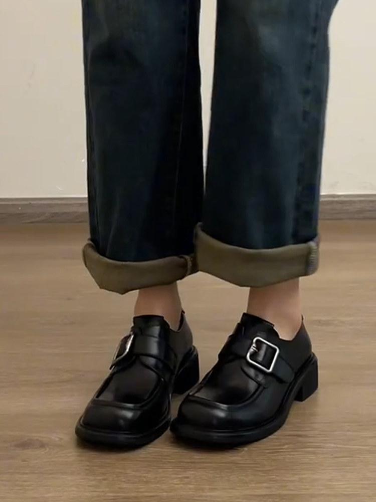 British temperament square head thick heel single shoes women's retro platform heightening loafers small leather shoes