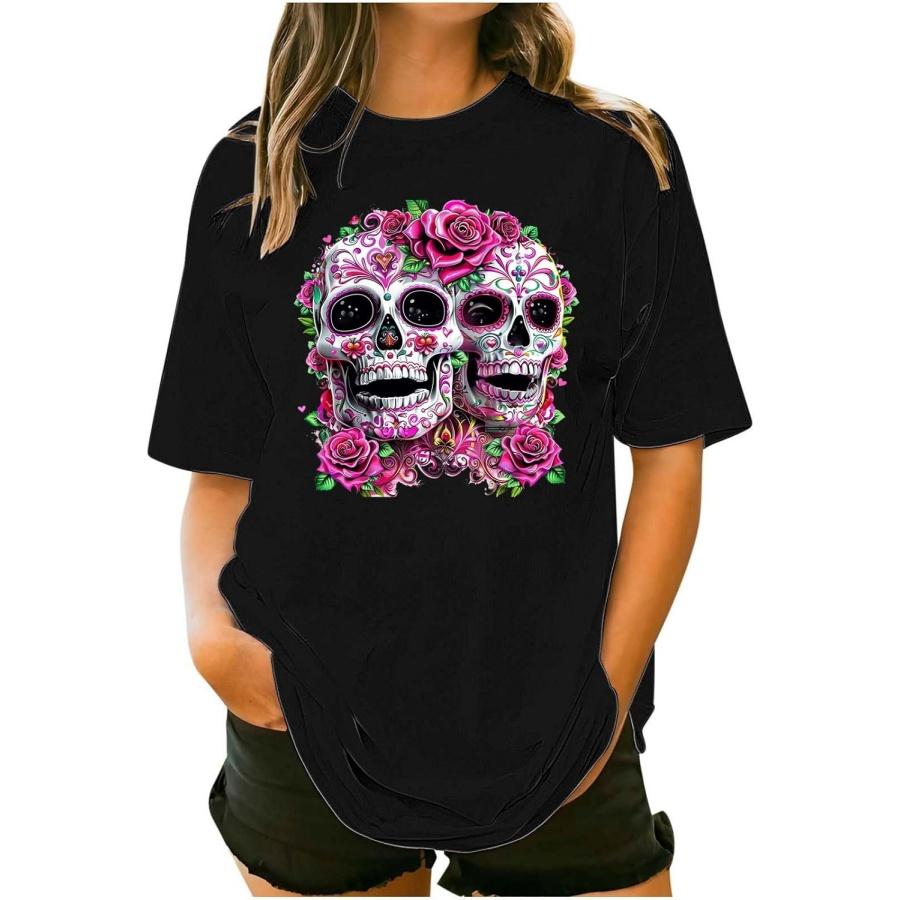 bawilom Skull Shirt for Women Vintage Skeleton Graphic Tees Oversized Goth Punk Rock T Shirts Novelty Horror Halloween Tops