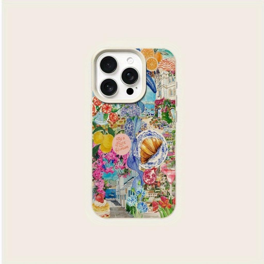 A Fresh and Simple Collage-Patterned Lychee-Textured Phone Case, Suitable for iPhone 17, 16, 15, Plus, Pro, Max Series Phones — Can Be Used as a Gift