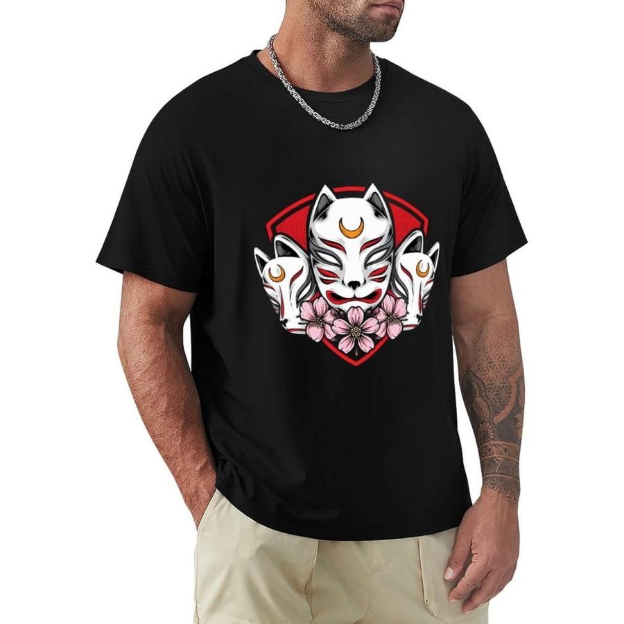 Mens Graphic T-Shirts Japanese Kitsune Mask Print Comfort Cotton T Shirts Fashion Men's Short Sleeve Shirts Casual Tshirts
