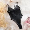 European and American Women’s Sexy Lingerie Sheer Mesh Deep V Push-Up Bodysuit with Double Spaghetti Straps, Solid Color Intimate Wear