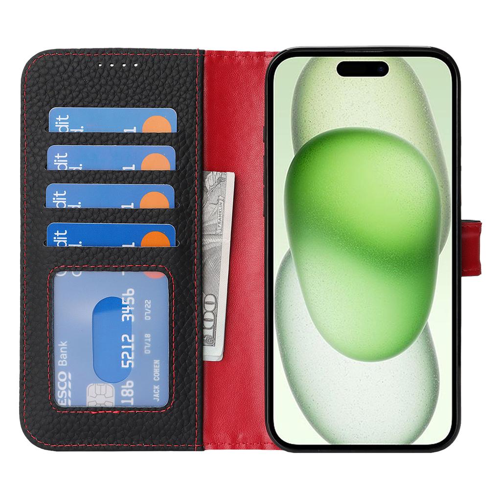 For iPhone 15 Plus/14 Plus Stand Case Litchi Texture Genuine Cow Leather Wallet Phone Cover RFID Blocking