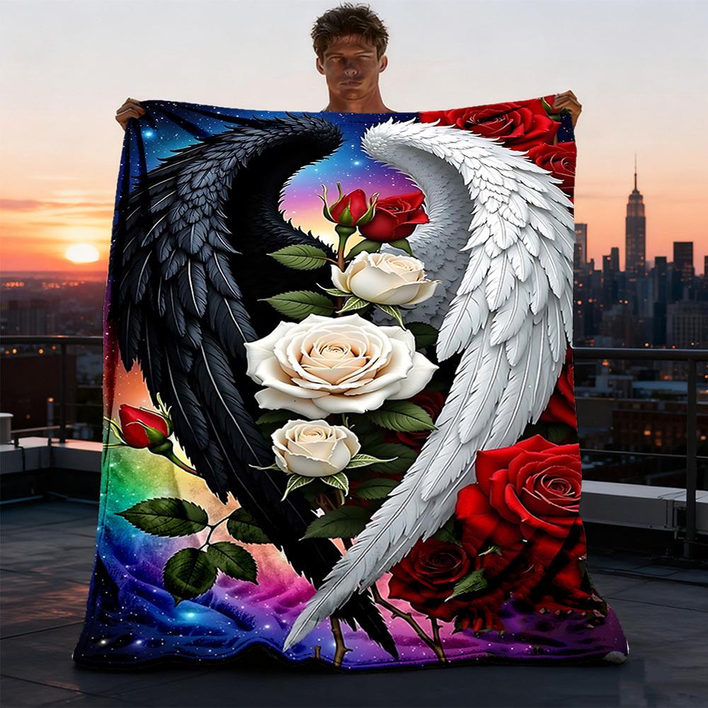 1pc Angel Wings Roses Throw Blanket Polyester Fiber, Lightweight Flannel, Soft & Warm, All Season Use for Outdoor, Camping