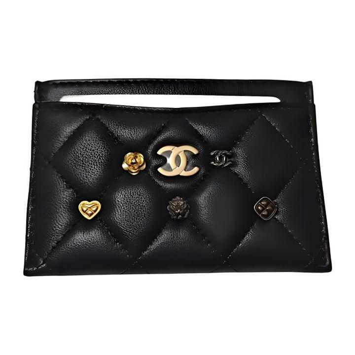 Chanel 23A Kadın Altın Tokalı Amblemli Kapitone Kuzu Derisi Kartlık Siyah