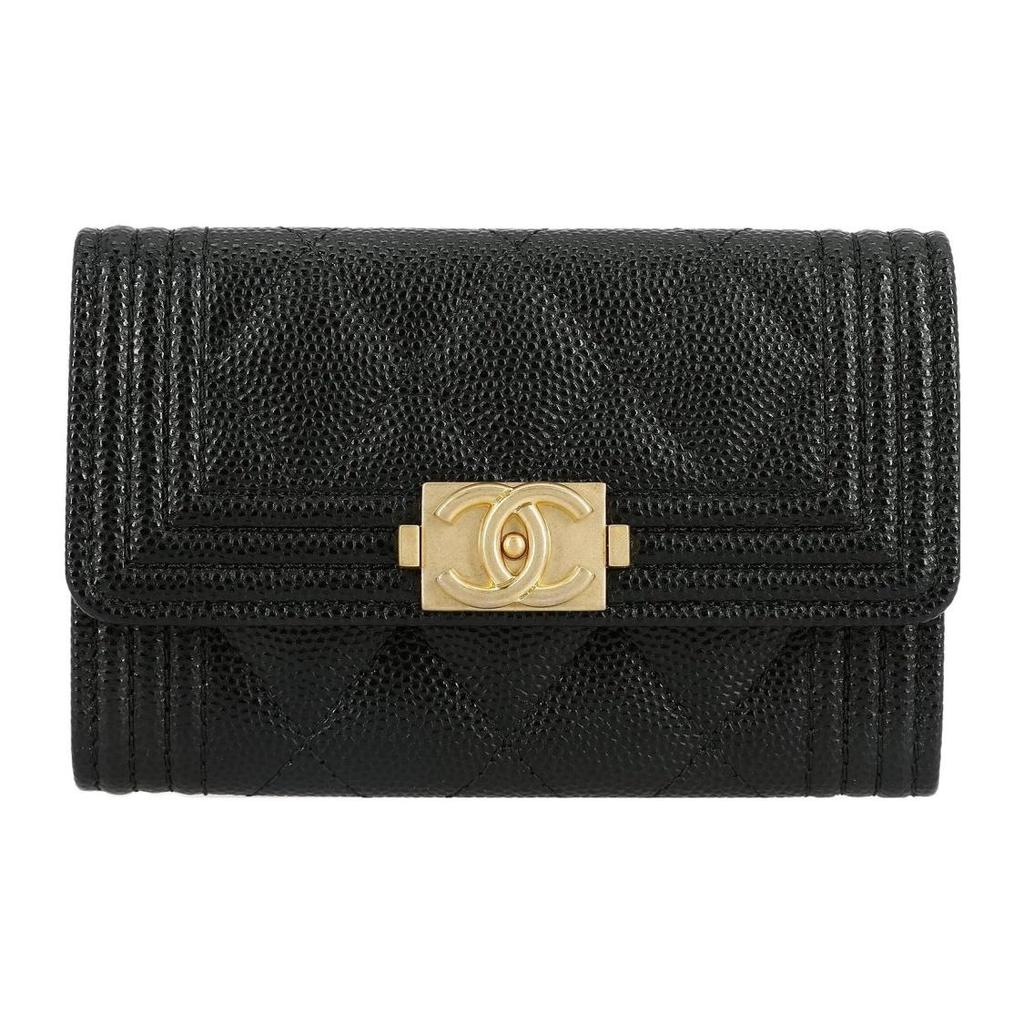 CHANEL 21K Winter Leboy Gold Buckle Diamond Pattern Snap Closure Textured Litchi Leather Top Handle Bag Card Holder Wallet Women's Black