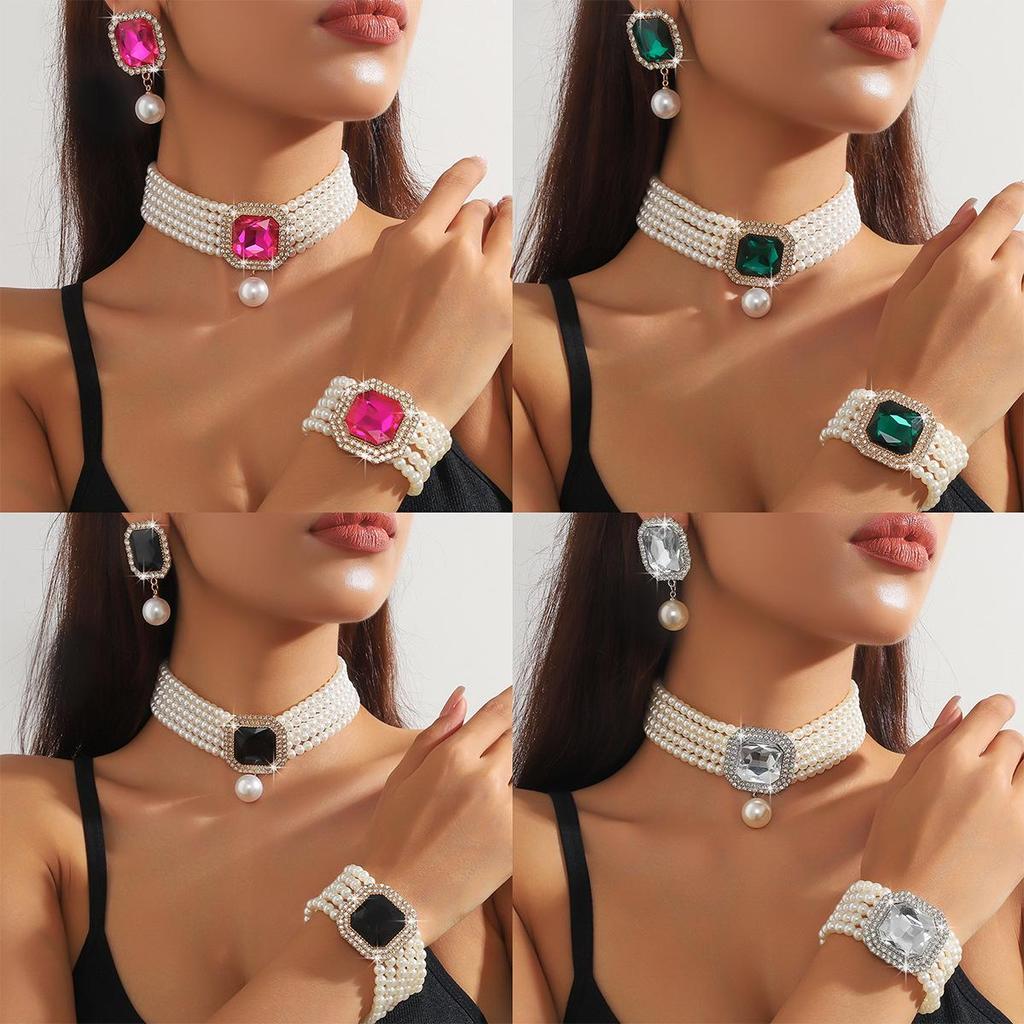 European Luxury Multi-Layer Faux Pearl & Crystal Jewelry Set – Necklace, Earrings, Bracelet - Colorful, Fashionable, and Exquisite Accessories