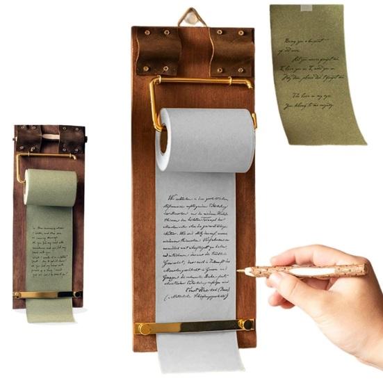 This vintage scroll pad features high-quality paper memo rolls that provide a smooth, seamless writing experience, perfect for quick notes, to-do lists, brainstorming sketches, and family messages. Designed for daily use, it includes a top metal ring for easy hanging and a bottom metal tear strip for neat paper removal. A dedicated slot securely holds the included wooden pen, ensuring it's always within reach.