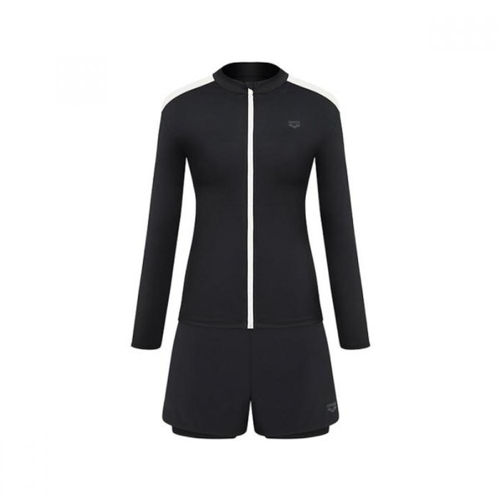 The Arena Women's Wavey Regular Fit Rash Guard Set (A6BL1PS02_BLK) offers a comfortable fit with UV protection. This set is ideal for beachwear and swimming, featuring a zip-up top that makes it easy to put on and take off.