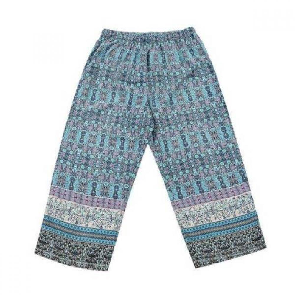 Wakoru's floral border print women's easy wear pants (WPAA203P) features vibrant colors and sophisticated design. With an in-band elastic, it's comfortable to wear during activities.