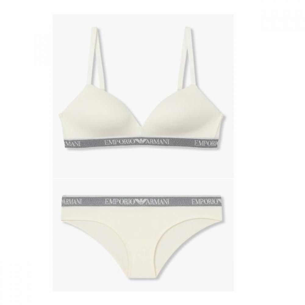 The Emporio Armani women's padded triangle bra and brief set features a comfortable no-wire design. The padded bra provides a soft shape and features a line-banding design with repeat logos that enhance its style. The brief features the repeat logo detail and offers a stable fit with its stretchy cotton material.