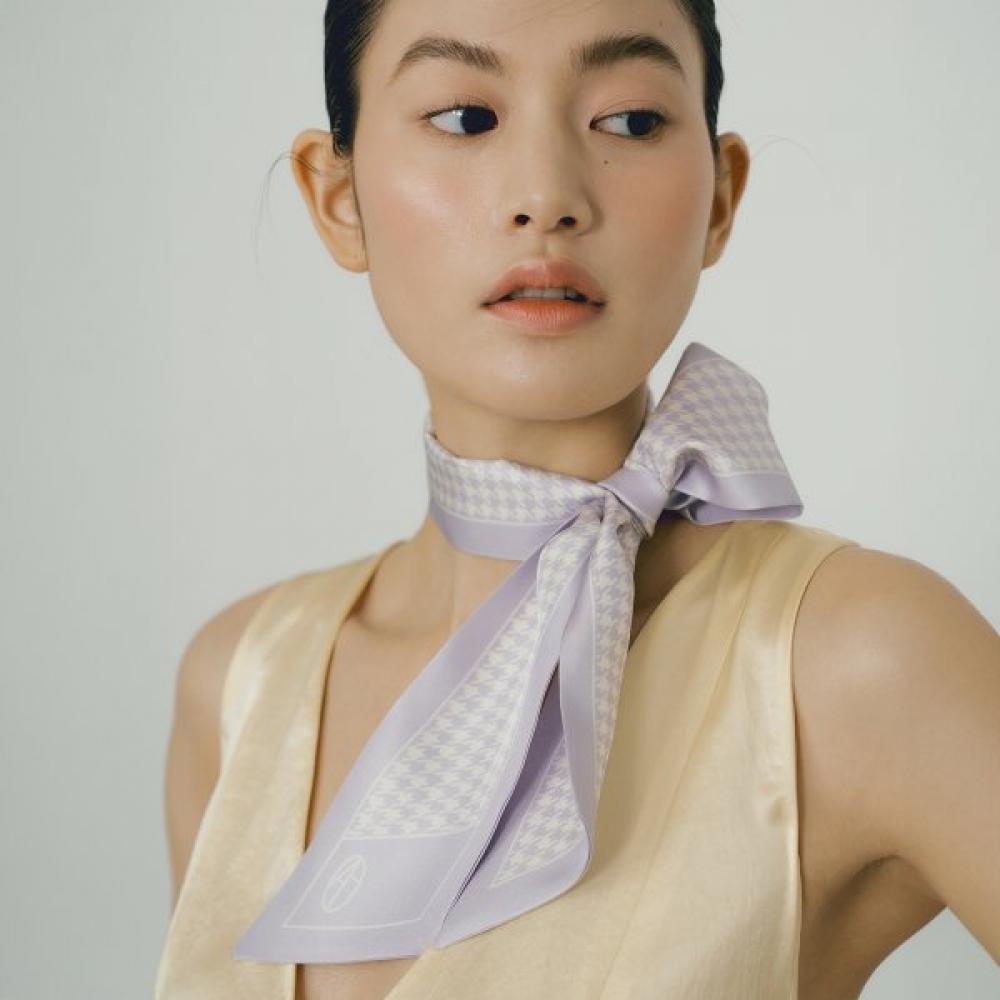 The Abinaferle Long Twilly Silk Scarf - Houndstooth Lavender is a signature piece of the brand, featuring a houndstooth pattern in a lavender color. This scarf boasts a simple design, adding sophistication to various looks. It can be worn in any season.
