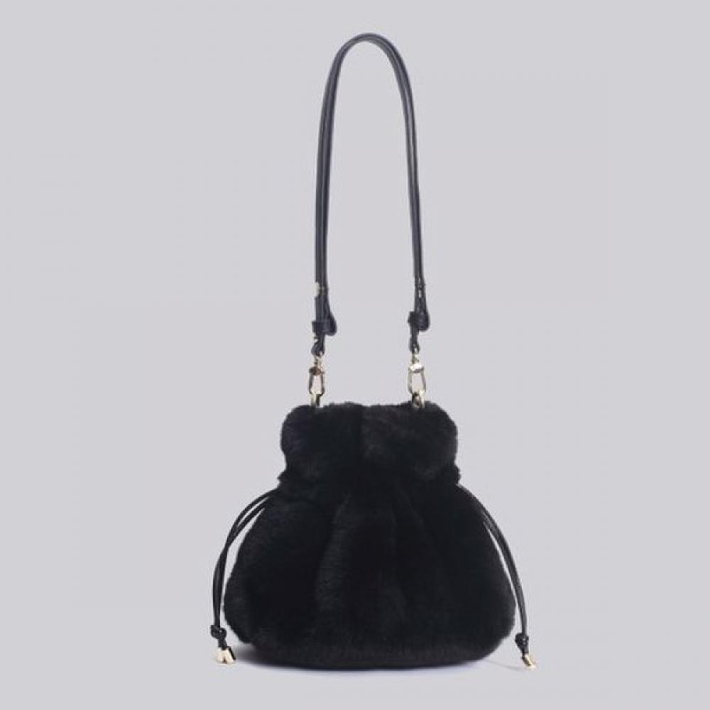 The LALA Fur Pouch Bag - Black is a mini bag in a pouch style featuring soft fur embellishments and crochet details. It can be used as a clutch or shoulder bag, making it a versatile fashion item.