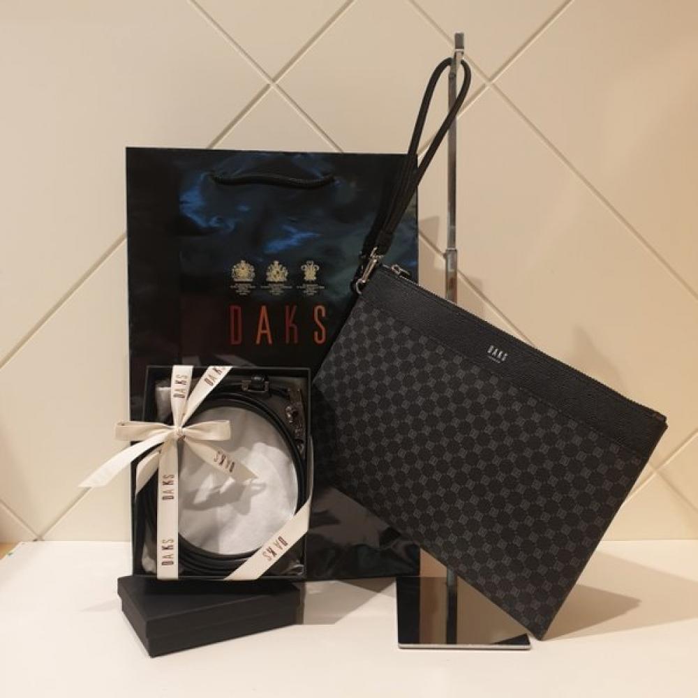 The Daks bag and belt gift set (DBBA1E467/DBBE1E762) includes a classy black leather slim clutch bag and an automatic belt with a DD pattern. The clutch bag is compact and suitable for daily use, while the belt pairs well with suits and semi-suit looks.