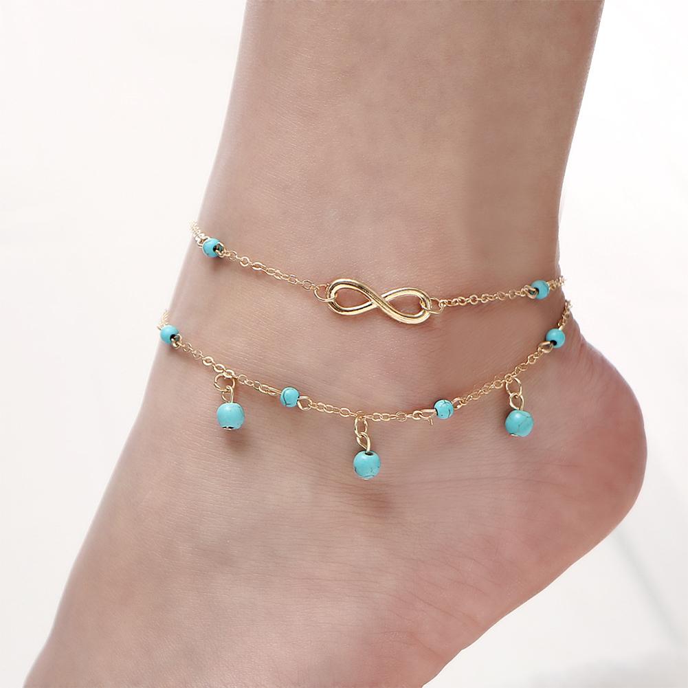Fashion Women Elegant Beach Anklets Double Layer Inlaid Turquoise Ankle Chain
