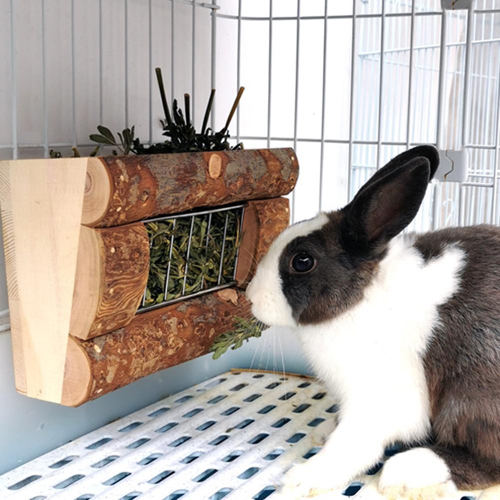 Rabbit Natural Wooden Grass Shelf 304 Stainless Steel Net Hay Dispenser Hanging Hay Feeder For Guinea Pig