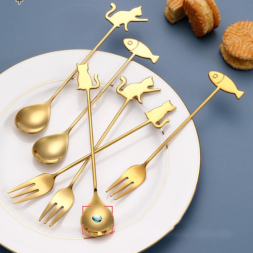 6pcs Spoons Fork Set 304 Stainless Steel Cat Fish Shape Coffee Snacks Fruit Prikkers Dessert Fork Kitchen Tool