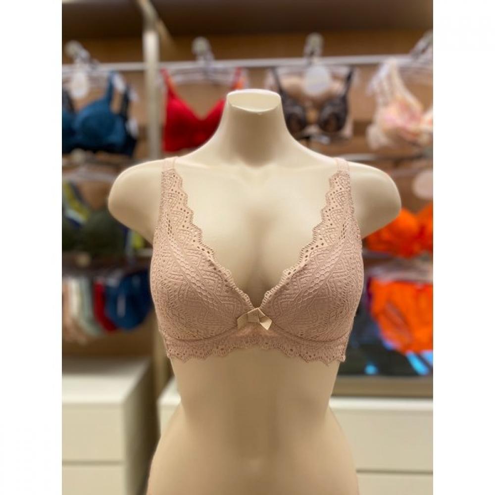 The 2COLOR [Barbara] Lace No-Wire Bra (ABR4411) is designed to gently wrap around the chest line from the sides, emphasizing a comfortable and stable fit, featuring a no-wire design. Its basic molded cup is thin, and all sizes come with a pocket for padding, allowing for volume adjustment. The subtle patterned lace adds a point of interest to the simple design, and the V-shaped chest line holds well without floating up, while the soft stretch fabric adheres naturally to the body.