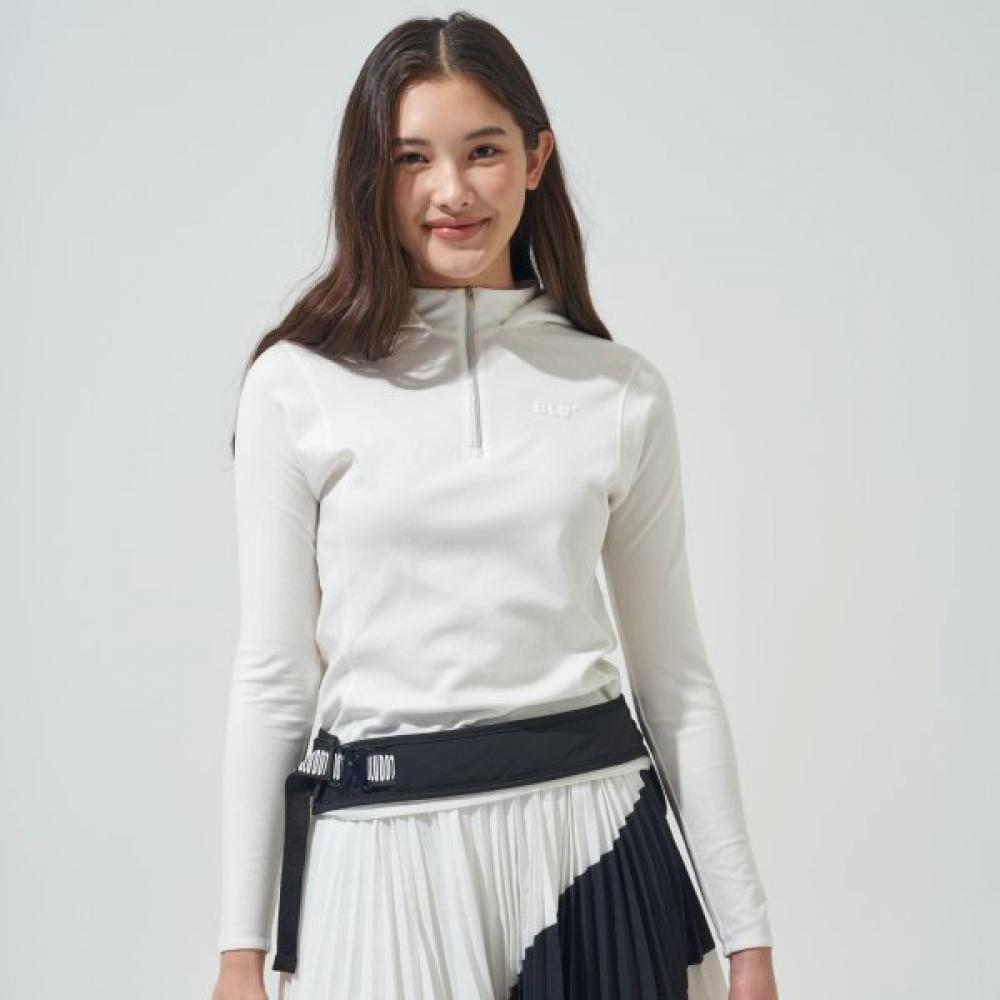 The BLUDOT Hoodie Rounding_WH is a long-sleeved t-shirt classified as women's golf wear. Designed as a half-zip hoodie, it provides a generous length ideal for golf swings, covering down to the hip line. It ensures a comfortable fit with unrestricted 360-degree movement and features bold detailing on the back.