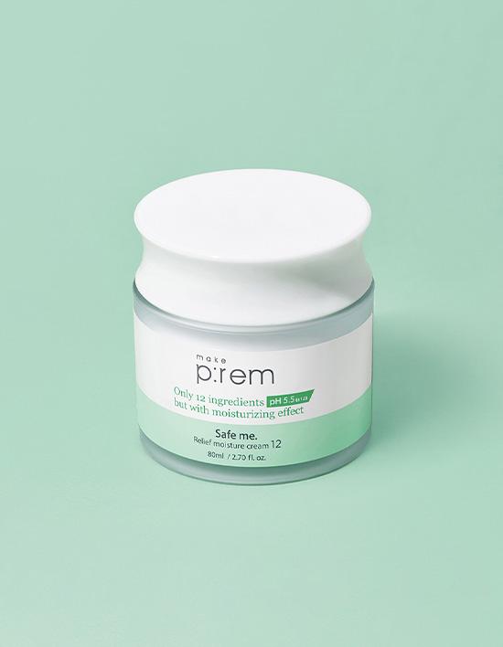 Makeprem Safe Me Relief Moisture Cream 12 80ml is a mildly acidic moisturizing cream made with only 12 ingredients. It gently applies without irritating the skin and provides long-lasting hydration, calming the skin. This product includes a complimentary Safe Me Relief Moisture Cream 12 10ml.
