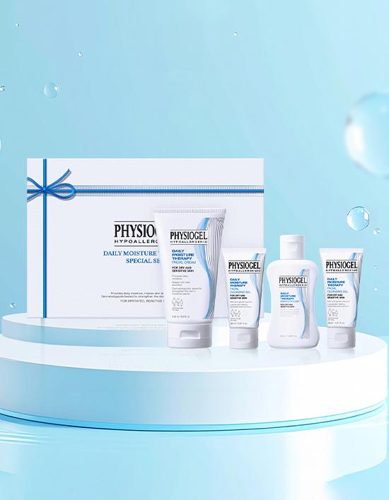 Physiogel DMT Cream Gift Set includes a 150ml facial cream, a 30ml facial cream as a gift, a 50ml essence toner, and a 30ml cleansing gel. This product is particularly beneficial for dry skin, providing intensive hydration that strengthens the skin barrier and helps retain moisture.