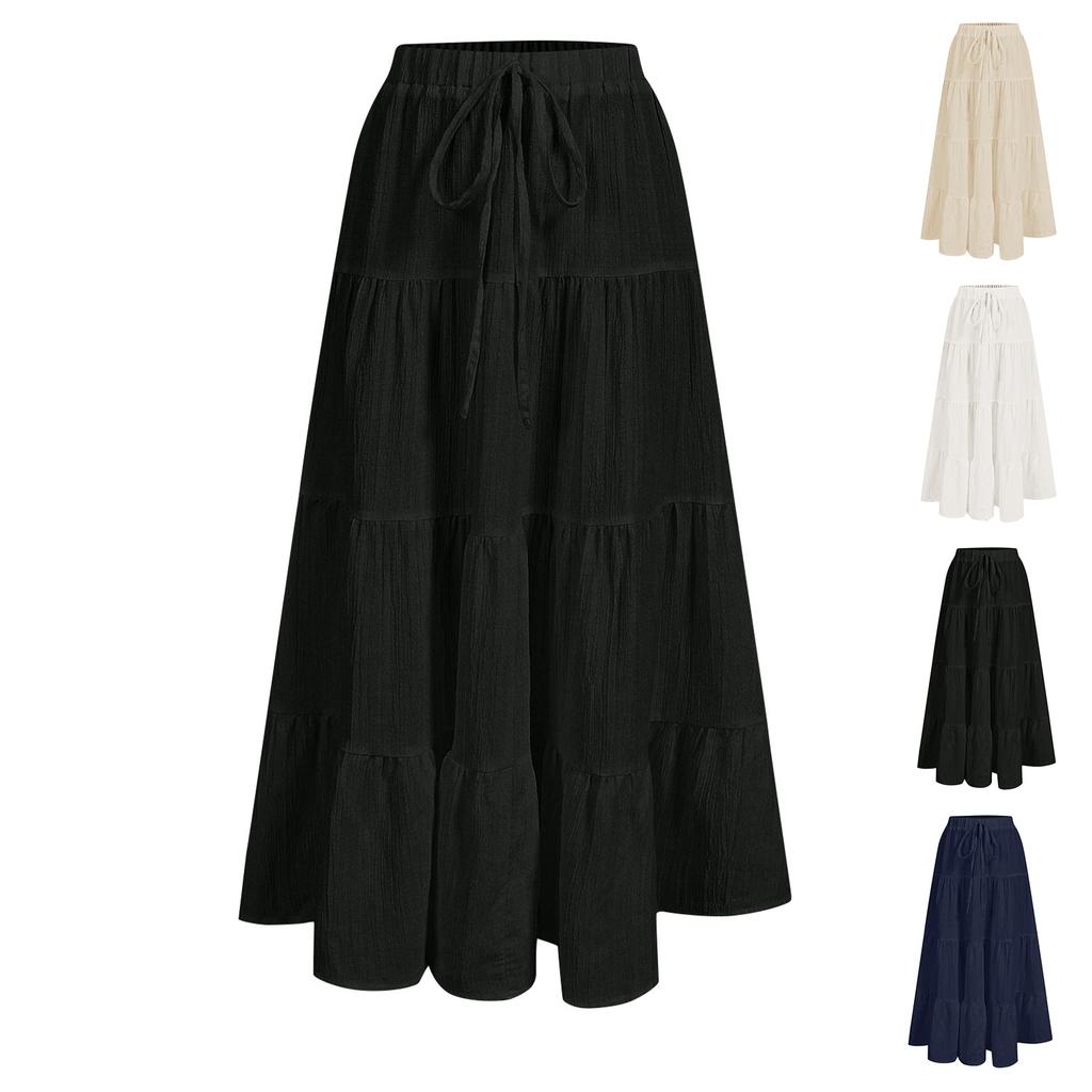 Women's Ruffled Spring Casual Long Skirt Plain Color Skirt Retro Pleated Skirt