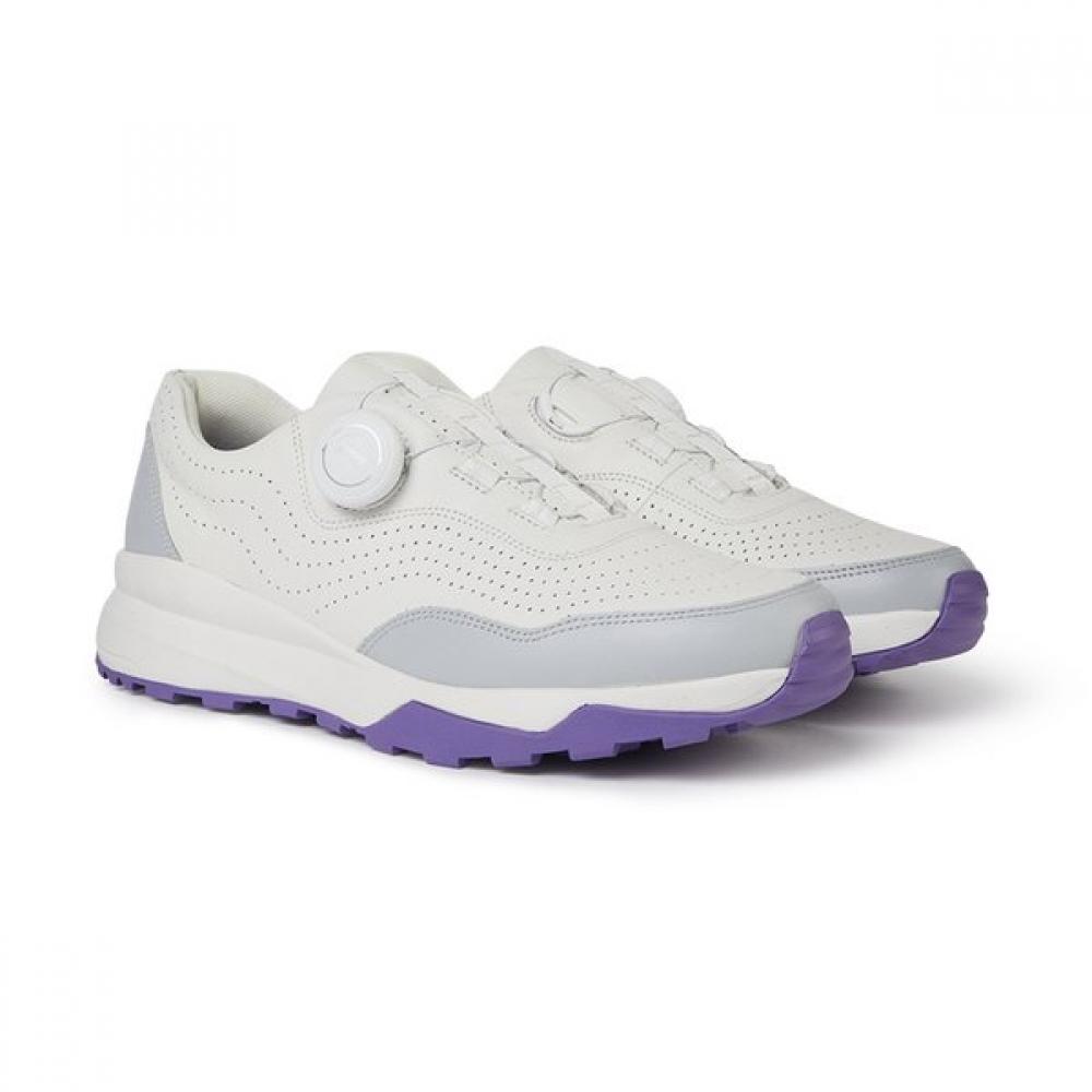 The Camper women's golf shoes LOOPER G200706-008 are leather sneakers in white and grey, allowing for adjustment to fit properly through the dial locking mechanism. They provide excellent breathability and comfort on the field while the removable insole pad adds a sporty feel. The detailed punching design and urban-style shoelaces complete a sophisticated silhouette.